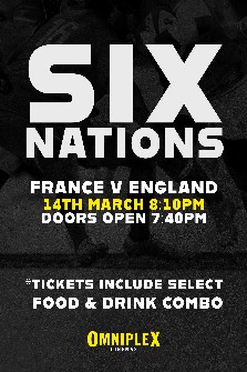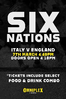 Catch the Six Nations matches live in the luxurious surroundings of Omniplex Wigan! Service staff will be in-screen throughout the match, so you can place orders and have food & drink delivered straight to your seat. Coverage starts 30 minutes...
